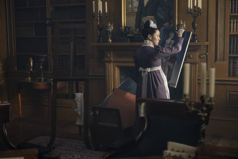 NetflixEvery season of "Bridgerton" has a serious, quiet room like this. Dark wood walls, built-in bookshelves, and candlelight make it feel warm and a little intense. It's simple, but the deep brown tones give it weight. Low lighting and rich wood are really all you need to copy this mood.