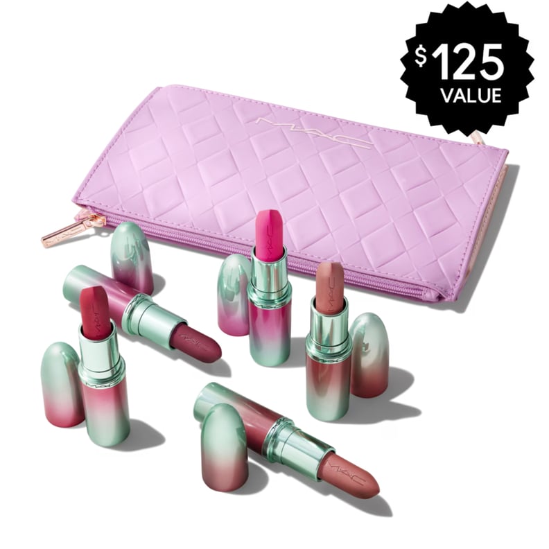This lipstick set comes with five bestselling MAC lipsticks, including neon-pink Candy Yum-Yum, the always-iconic Ruby Woo red, warm neutral Velvet Teddy, deep-berry Captive Audience, and soft-pink Sweet Deal. Whether they're restocking old favorites or trying these shades for the first time, it'll definitely level up their lip game.